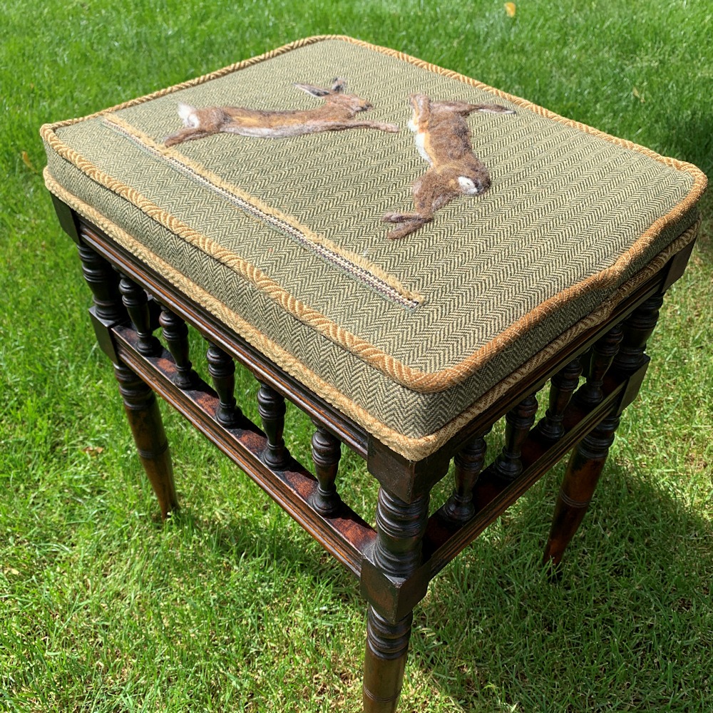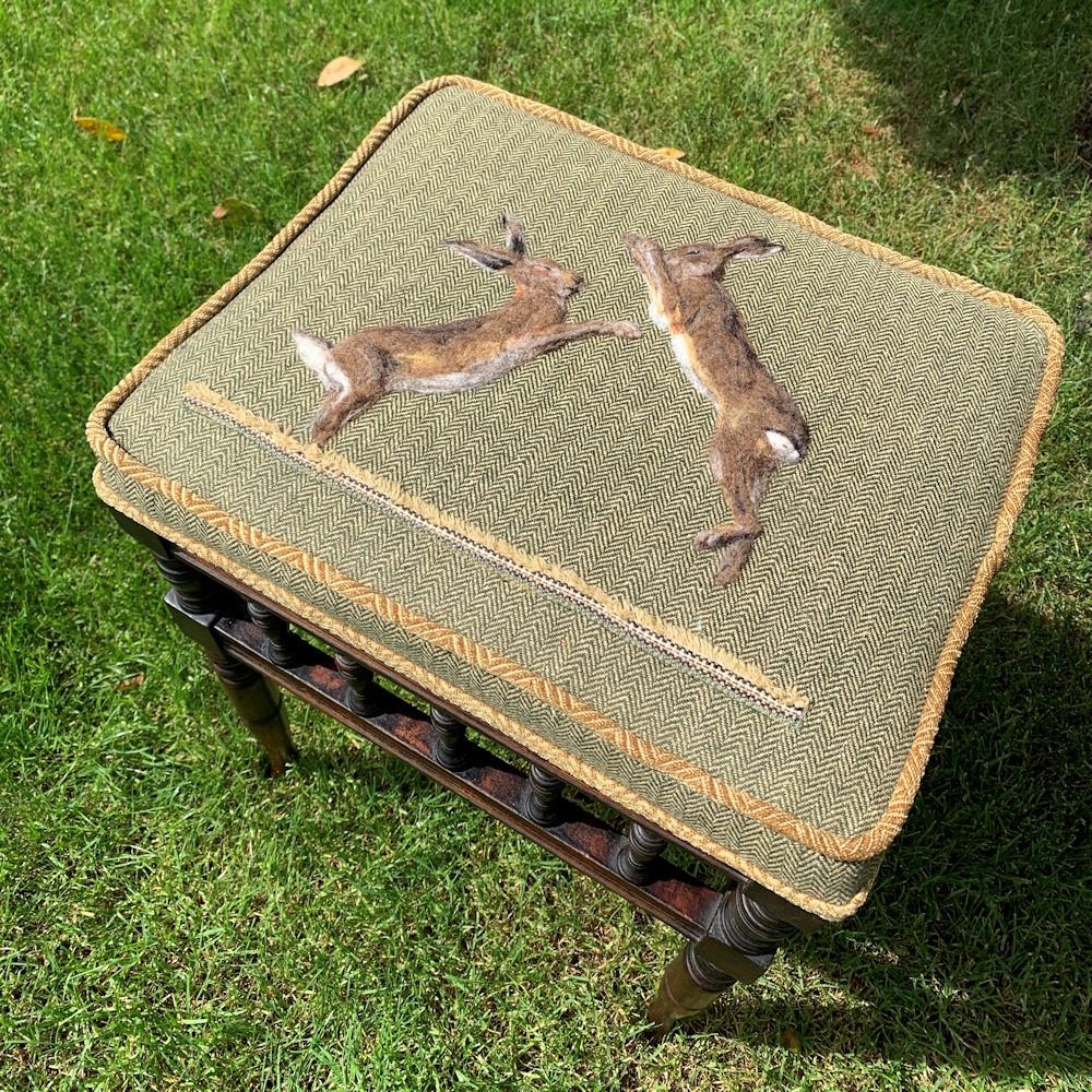 Boxing Hares Upholstered Piano Stool is a unique collaboration of my original felted art with Ella Jenkin’s upholstery skills. It features two detailed hares that I needle felted directly onto the tweed fabric using Shetland wool.