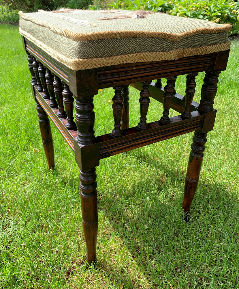 We liked the aged look of the wood and just cleaned it. There are some marks and a small crack on the inside of the frame. This doesn’t affect the strength of the stool. The design has been needle felted a lot so that it won’t rub off or lift as the stool gets sat on.
