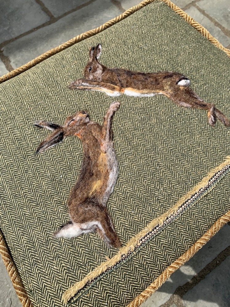 We started with a second hand piano stool that Ella stripped and cleaned. I needle felted the boxing hares onto the tweed fabric using Shetland wool. Once I dropped the piece off to Ella, she stitched the selvedge edge under the hares to look like grass. Then she stitched it into a seat, added more wadding and expertly upholstered it to the wooden stool base.