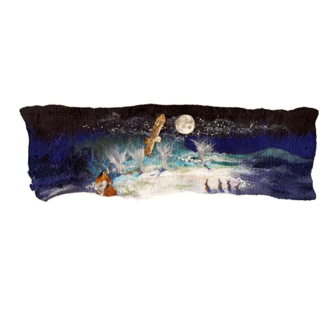 I created this piece early in 2024 and wanted to create my first panoramic night sky picture. I started with choosing dark blues and black wool. As I started laying down the wools I decided to add the moonlight, trees with shadows and some lighter blues for a wintery glow. From there I added lots of silk fibres and then wet felted the background together. Once felted I decided on the hares/bunnies quickly and they were needle felted in. Then came the fox looking intently at them. The owl was needle felted last and then I added my first needle felted moon. Each needle felted piece took over 3 hours to add.
