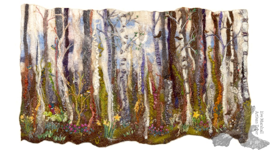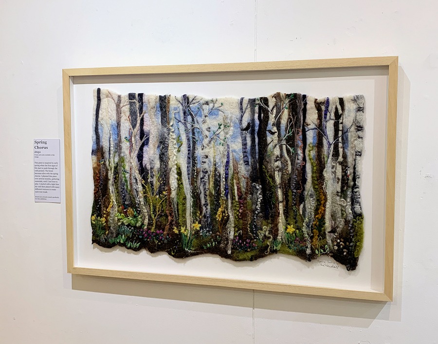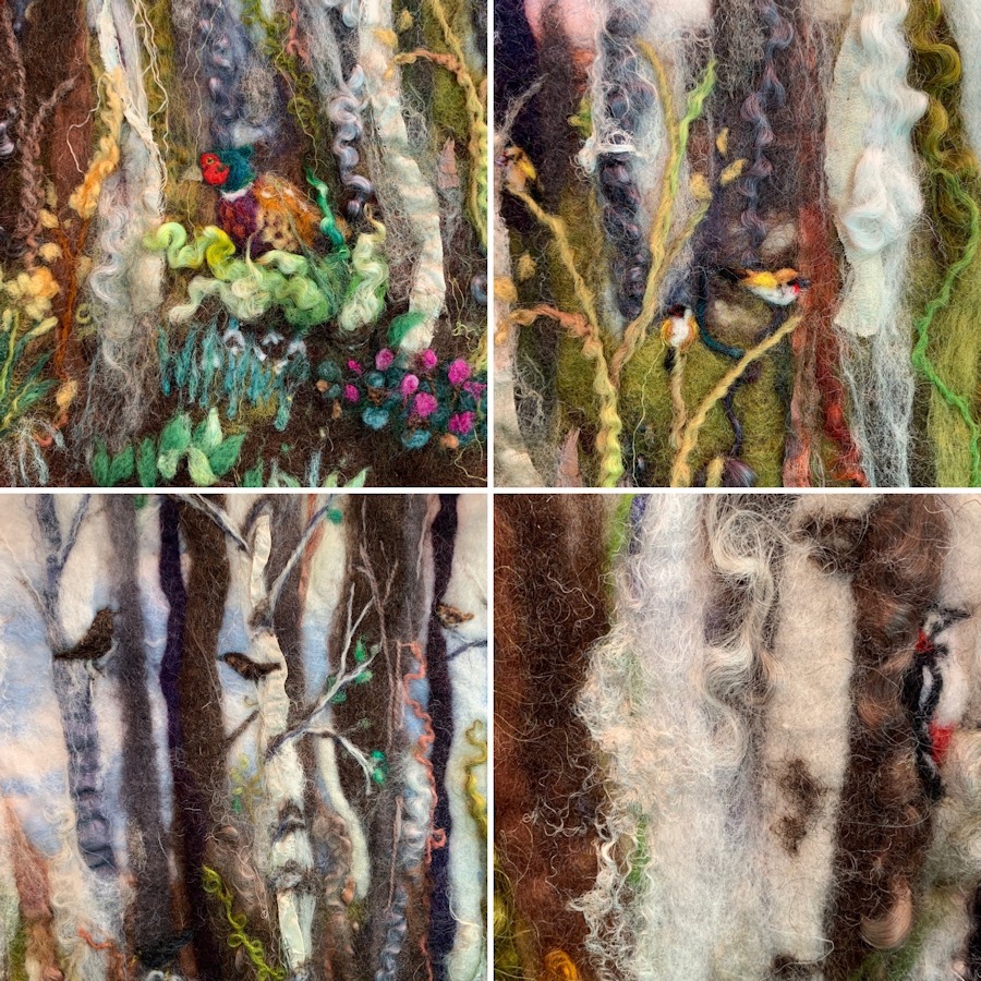 This piece is wet felted with lots of texture like silk fibres, wool curls and merino wool. I have needle felted tiny blue tits, goldfinches, a pheasant, crows, a woodpecker and sparrow among the trees.