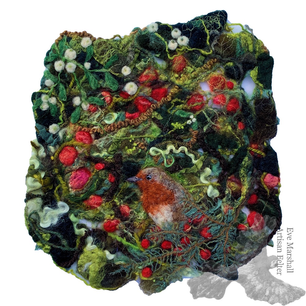 I used a mix of merino wool, silk fibres, yarns and wool curls to create the background. The berries, robin and branch were needle felted in the foreground.